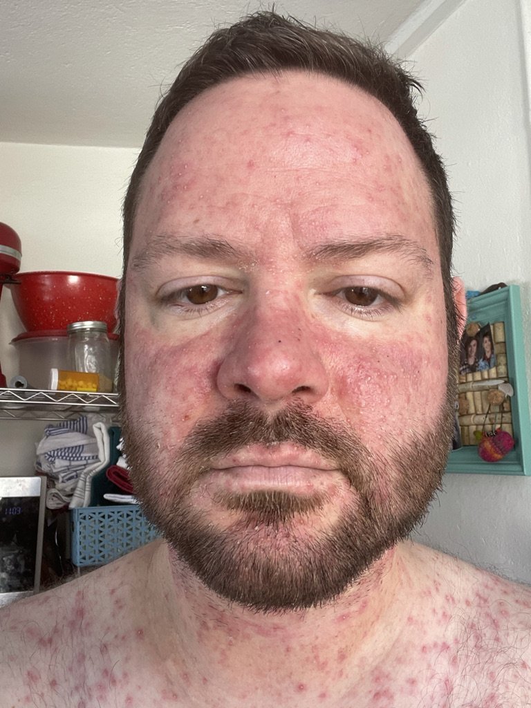 The rash is like whiteheads with sunburn on top. The antibiotics and ointments I’ve been prescribed have seemed to have a negligible effect. This should all be clearing up in the next couple of weeks, but unlike waiting for a drug to exit your system, I’m waiting for my body to stop its immune response. Which doesn’t seem to be slowing down yet. Below is a picture from today, 2/23:
